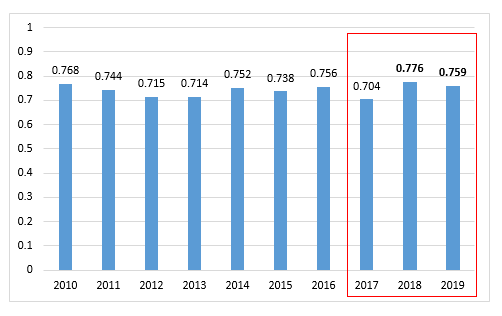 Los datos utilizados para este análisis provienen de una recopilación del “Credit Suisse Global Wealth Databook 2010-2019”. En efecto, la riqueza se entiende como “la posesión de activos productivos. Entre ellos se encuentran “la tierra, la propiedad del capital físico de las empresas, la banca y activos financieros” (Solimano 2009, 11). Lo primero que resalta es que la desigualdad de riqueza es más alta que la desigualdad de ingresos: el índice no es superior a 0,551 en todo el periodo 2007-2019 (sin embargo, ha aumentado en los últimos tres años y beneficiado a los de ingresos más altos ). Eso se debe a que de cierta manera la desigualdad de ingresos se matiza por la existencia de política pública que permite el acceso al capital educativo (Esquivel, 2015) con gobiernos que realicen política redistributiva no como el actual que ha realizado una serie de recortes, incluyendo a las universidades públicas. Por otra parte, el acceso a otros capitales como el empresarial, financiero, etc. es más complicado y cuando existen medidas de política pública que lo realizan y son saboteadas por actores económicos interesados en que la desigualdad se mantenga, como ocurrió con la ley de plusvalía (Báez, 2018).
