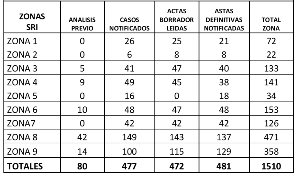 Según la tabla 1, durante el año 2018, el SRI, realizó 1.510 auditorías tributarias en las 9 zonas de la administración tributaria, la mayor cantidad se efectuaron en las zonas 8 y 9 correspondientes a las provincias de Guayas y Pichincha con 471 y 358 auditorías respectivamente; 481 son actas definitivas y notificadas a los contribuyentes; a pesar de ser un examen sistemático, objetivo y profesional, varias de éstas actas de determinación tributaria serán impugnadas por los contribuyentes, produciéndose controversias entre la administración tributaria y los sujetos pasivos, para ser dilucidados por el Tribunal Fiscal.