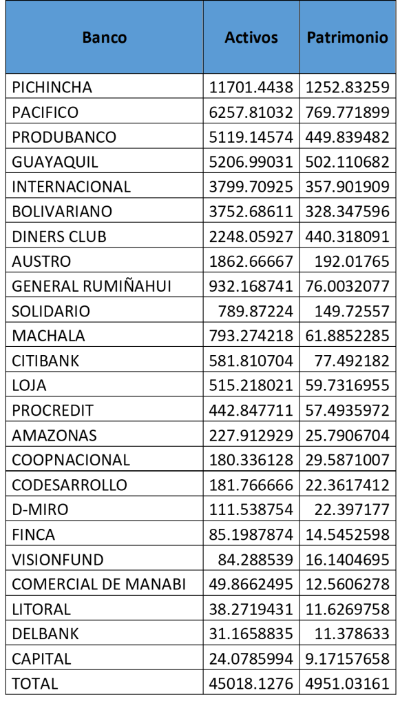 Entre enero y agosto de 2020, durante la emergencia sanitaria provocada –más que por la epidemia- por los recortes del presidente Moreno al sector de la salud y el pago de la deuda externa, la banca (un total de 24 bancos) aumentó su activo y patrimonio en un 6% y 11% respectivamente. Si bien existen variaciones entre entidades, los 4 principales bancos (ver tabla 1-2) muestran esta tendencia de crecimiento. En un periodo plagado por despidos, por la pérdida de recursos económicos para la mayoría de la población ecuatoriana, se observa que la banca no pierde. No obstante ¿Por qué entonces la liberalización de las tasas de interés? ¿Por qué el escaso y casi nulo apoyo crediticio a la MIPYMES para la reactivación de sus actividades? Porque la banca no solo no debe perder, debe ganar cada vez más y el récord de utilidades en 2019 (USD 616 millones) debe superarse y ni la pandemia ni la vida de los habitantes del país deben impedirlo. Lamentablemente, con un gobierno y todas sus instituciones subordinadas a a la banca va a realizar todo lo que esté a su alcance para lograrlo.