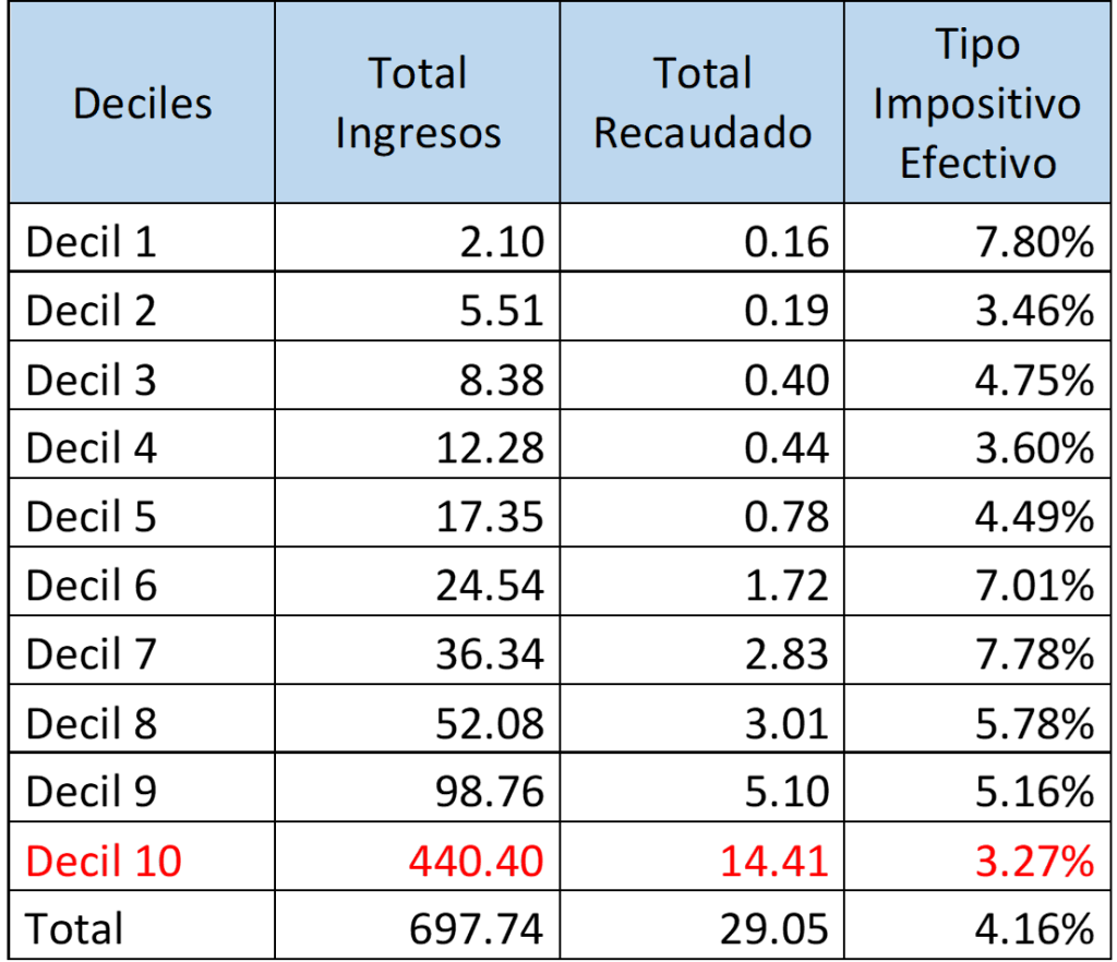 En el estudio “Panorama Fiscal de América Latina y el Caribe”, elaborado por la CEPAL en 2018 y con información de 2014, se muestra que lo que el decil más rico de ingresos pagaba en relación a sus ingresos era de tan solo el 3,4%. Un porcentaje muy por debajo del promedio de América Latina con el 4,8% y todavía más lejano del 21,3% de lo que pagan en la Unión Europea. Si se compara con lo que paga el decil más rico de los ricos en 2019 la magnitud es similar y se confirma que la élite económica en el país no paga demasiados impuestos.
