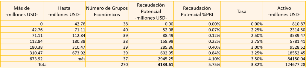 Una vez considerado este elemento se utiliza una tabla de recaudación progresiva, similar a los montos establecidos en el caso de Argentina [4] (considerando que en estos dos países existe la presencia constante del Fondo Monetario Internacional –FMI- , con la diferencia de que en Argentina no se subordinó el pago de deuda externa a las vidas de las personas pre pagándola[2] como sí ocurrió en Ecuador).[3] De esa manera, se presenta en la Tabla 4 los montos de recaudación con 7 rangos para que los GE con activos inferiores a USD 42,76 millones no paguen, en el segundo rango se encuentra una tasa del 2,25% a GE con activos superiores a USD 42,76 y menores a USD 71,11 millones; De tal manera que la tasa más alta es del 3,50% a aquellos GE con más de USD 673 millones. Lo recaudado equivale a más de USD 4 133 millones representando el 3,32% del total del activo y representa el 5,75% del PIB. Por lo tanto, se obtiene una recaudación de las grandes fortunas con un impuesto a la riqueza y la contribución recae a solo el 0,007% de la población. No obstante, este debe ser permanente.