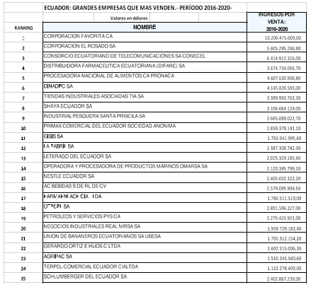 La información que entrega la Superintendencia de Compañías Valores y Seguros es la base para demostrar el grado de concentración empresarial ecuatoriana, evasión tributaria y beneficiarios de las crisis, en el período 2016-2020. Se focaliza a las 100 principales empresas clasificadas según ingresos por ventas de más de 120 millones dólares, del año 2020. Estas mismas empresas se consideran para el quinquenio citado. Se excluyen empresas que no tienen información completa para cada uno de los cinco años, como es el caso de la minera AURELIAN ECUADOR S.A cuyas exportaciones empieza en diciembre del 2019, siendo sus ventas de USD 358.8 millones de dólares (2020).