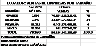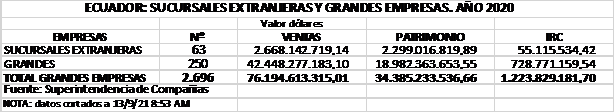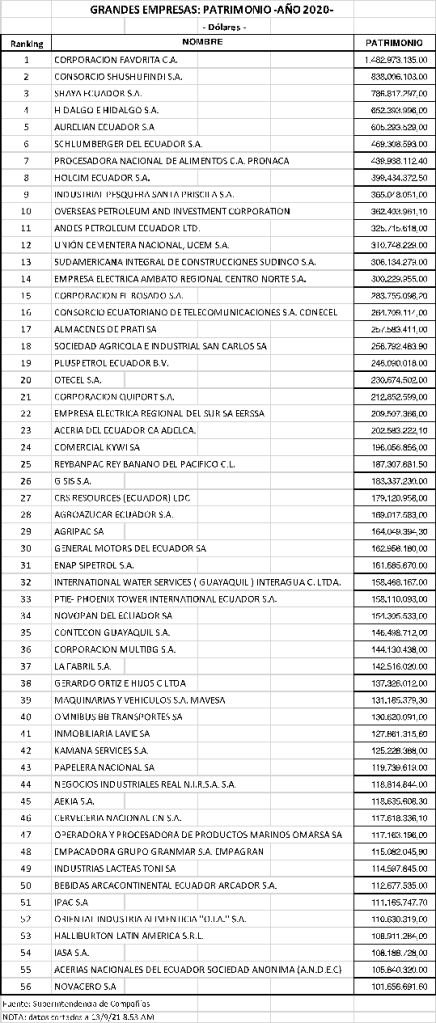 Por su tamaño las 2.696 grandes empresas concentran el 65.4% del patrimonio empresarial del 2020. Su monto representa el Presupuesto General del Estado para el año 2022, que asciende a $ 33.9 mil millones de dólares. Las 500 grandes manejan un patrimonio de $ 30.958.754.569,31, el 90 % del total de las grandes empresas. El 10% restante del patrimonio se distribuye entre las 2.196 empresas. Además, 55 de estas empresas poseen más de 100 millones de dólares de patrimonio.