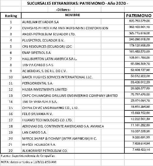 Del ranking empresarial por tamaño, que entrega el organismo de control público, 17 grandes sucursales extranjeras (de las 63 registradas) estan vinculadas a extracción de aceite crudo de petróleo, servicios extración de petróleo y gas, minas y canteras, venta de petróleo crudo; 16 son sucursales ligadas al transporte aéreo de pasajeros y carga; 7 vinculadas con la construcción; 3 a la generación eléctrica y electrónica; 1 a la producción de farmaceúticos; y, 1 sucursal extranjera elabora bebidas gaseosas no alcohólicas, entre otras.