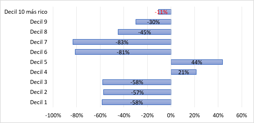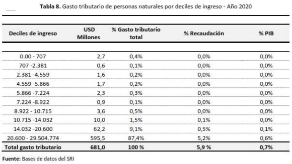 Entre 2019 y 2020 permite observar que los más ricos (decil 10) se han enriquecido más, su rango máximo de ingreso creció un 79%. Por otra parte, el gasto tributario (entendido como lo que las personas dejan de pagar al Estado) disminuyó para todos los deciles, sin embargo, para el decil más rico fue el que menos decreció. Finalmente, el gasto tributario se encuentra concentrado por este decil, por lo que el 10% concentra el 87%. Por tanto, las clases medias no se ven beneficiadas de las deducciones, contrario a lo que ocurre con los más ricos.