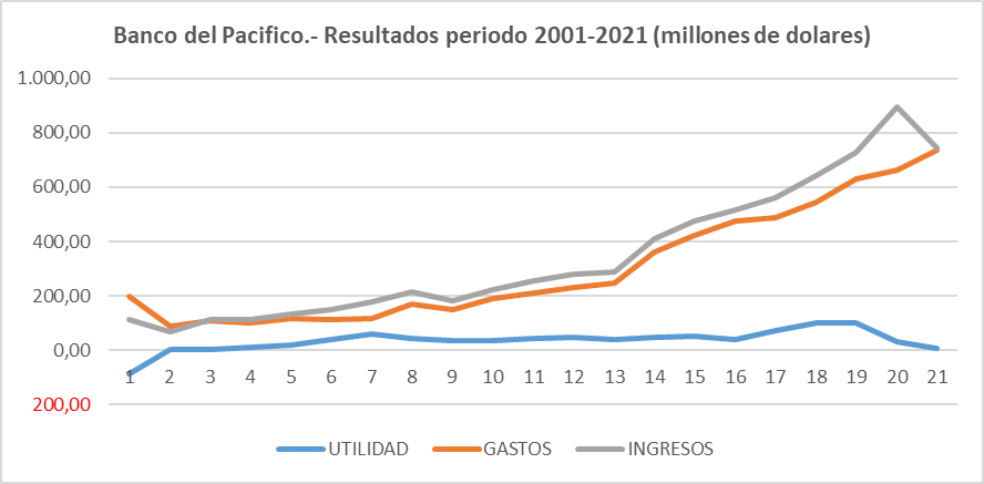 Los resultados obtenidos por el banco del pacífico durante el período (2001-2021), presentan un crecimiento constante; en el ejercicio económico del 2001 el banco presenta una pérdida por USD. 85.436.903,96 como resultado de la crisis económica durante los años 1998 al 2000; desde el año 2002 hasta el 2020 se generan utilidades con un comportamiento creciente, con pequeñas disminuciones en los años 2013 y 2016, siendo la utilidad más alta en el año 2019 por USD. 100.287.354,42 dólares y una drástica disminución de utilidades en el año 2021 a USD. 5.723.172,67 debido a reservas y provisiones financieras para depuración y regulación de saldos previo a la venta el banco, resultados que serán revisados por auditoría externa e informe de la calificadora de riesgos.