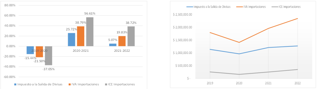 Gráfico 3. Variaciones del IVA, ICE e ISD 2019-2022 Gráfico 4. Recaudación total del IVA, ICE e ISD 2019-2022