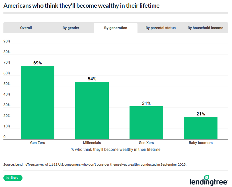 La organización LendingTree realizó una encuesta virtual a 2,000 personas en Estados Unidos en un rango de edad de 18 a 77 años en 2023.[1] Los resultados sobre si los estadounidenses creen que serán ricos en su vida indica que un 41% lo cree. Al desagregar dicha respuesta por nivel de ingresos entre las personas que no se consideran ricas (1.611), hay una ligera tendencia ascendente según el nivel de ingresos. Mientras más ingreso se tiene más creencia de que algún momento se alcanzará a ser rico. Lo interesante es que la clase media alta,[2] según la encuesta personas con ingresos anuales entre $75.000 y $99.999 tiene un nivel más elevado de creencia con un 51%. Por encima de la clase alta con ingresos por encima de los $100.000.[3] Lo que parece aportar a la siempre presente hipótesis de una clase media aspiracionista que está dispuesta a todo para ser rica. Sin embargo, sería un poco laxo confirmar aquello a la luz de los datos antes presentados. Por otra parte, existen otras clasificaciones para observar la diferencia entre creencias por distintas características como el género y el estatus parental. No obstante, es en la clasificación de generaciones etarias que la tendencia está claramente marcada. Menos edad más aspiración de ser rico en algún momento de la vida.