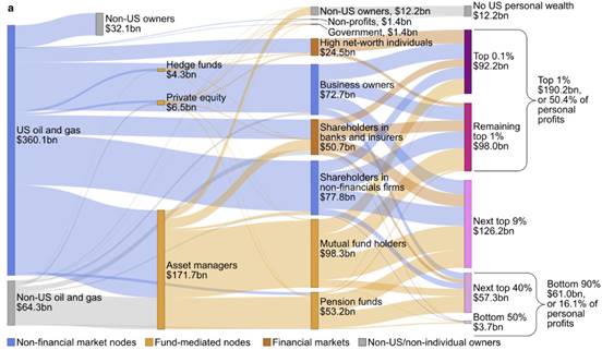 El diagrama de Sankey muestra cómo los beneficios obtenidos por las empresas petroleras y gasísticas en 2022, tanto en Estados Unidos como en otros países, son gestionados por gestores de fondos y acaban en manos de beneficiarios situados en distintos niveles de la distribución de la riqueza.