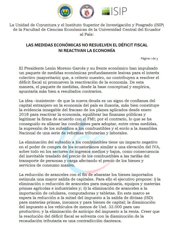 El eje de la reforma tributaria que el gobierno pretende aplicar en el país ha sido totalmente regresivo: i) aumentar el IVA, eliminar el impuesto a la salida de divisas, eliminar el anticipo al impuesto a la renta, etc. En resumen, medidas que afectan a los sectores más pobres de la población pero no trastocan las fortunas y los intereses de los sectores históricamente privilegiados. En ese sentido, las necesidades de financiamiento que tiene el Estado, efecto de una crisis autoinflingida por el manejo de las élites empresariales de la economía, puede solventarse a través de los impuestos progresivos. Desde esa perspectiva, el debate debe trasladarse al campo de los impuestos directos, de la evasión, elusión fiscal y de las deudas por materia impositiva. Si se controla la evasión del impuesto a la renta se van a tener USD 2,3 miles de millones, si se controla el IVA los ingresos alcanzarían los USD 2,8 miles de millones. Si se realiza el cobro de deudas de los 500 principales deudores se llegaría a tener recursos por USD 2,6 miles de millones (1,5 miles de millones en deudas firmes y USD 1,1 miles de millones en deudas impugnadas). En conjunto, el financiamiento total sería de USD 7,7 miles de millones. De esa manera, tan solo con el 55% de cumplimiento de estas medidas se llegaría a los USD 4,2 miles de millones del préstamo con el FMI y las nocivas reformas tanto laboral como tributaria no serán necesarias. Sigue leyendo «Sí hay alternativas: Control a la evasión del Impuesto a la renta, el IVA y cobro de deudas tributarias generarían USD 7,7 miles de millones»