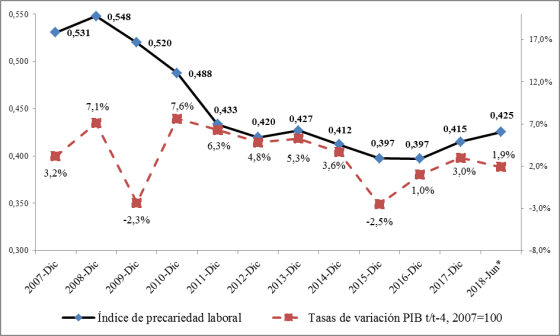 Es sumamente interesante como ciertos analistas económicos sitúan al crecimiento como uno de los pilares fundamentales para alcanzar el bienestar social, entendido como una serie de características deseables en una sociedad. Entre esas características no solo se encuentra el obtener empleos, sino empleos de calidad. No obstante, la postura que plantea el crecimiento como único camino para alcanzar empleos adecuados, carece de evidencia que lo sustente. De esa manera, a continuación se muestra como esta es una falacia y da lugar a repensar el problema de la precarización. En ese sentido, para observar la relación entre crecimiento económico y precarización se van a comparar las tasas de variación del índice de precarización y el VAB por rama de actividad entre junio de 2017 y junio de 2018. Sigue leyendo «Crecer no basta: Precarización y crecimiento económico en Ecuador»